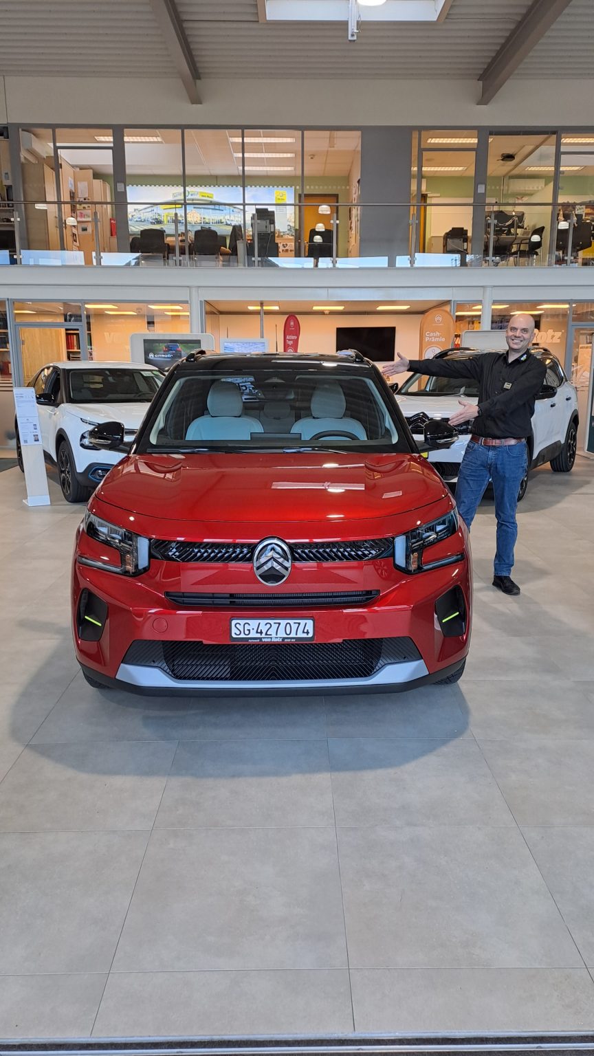 Schau bei uns vorbei zur Besichtigung oder Probefahrt des Citroen ë-C3 – wir freuen uns auf deinen Besuch! 😎 Unser Verkäufer Simone Donnicola, 071 913 33 66 oder donnicola@vonrotz.ch steht Ihnen mit Rat und Tat zur Verfügung.